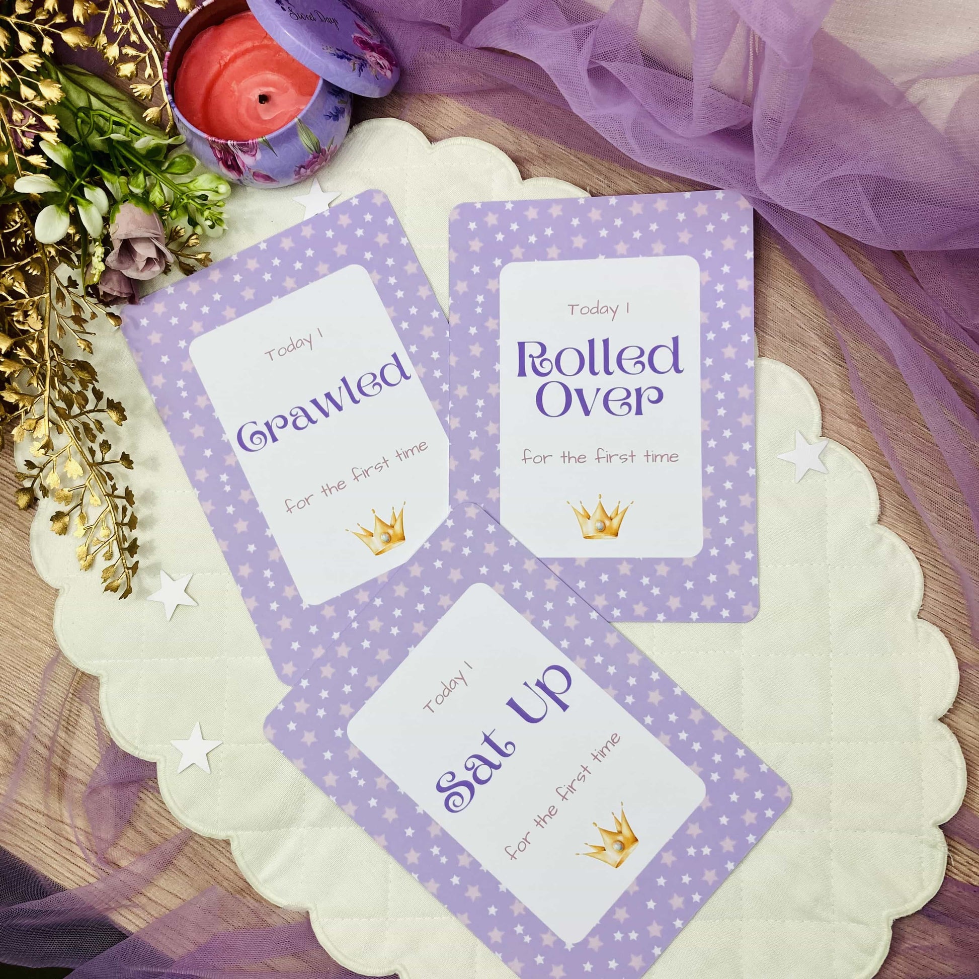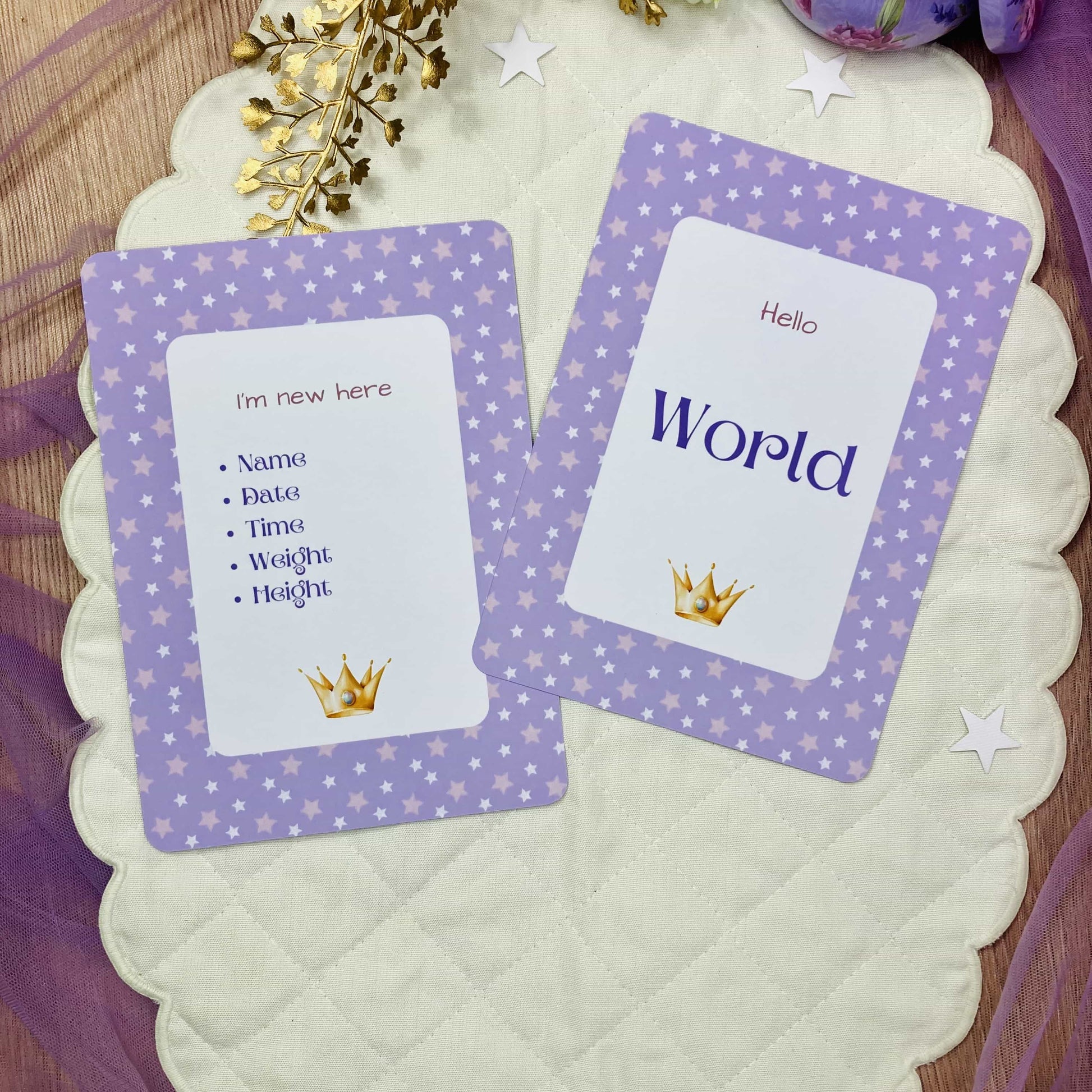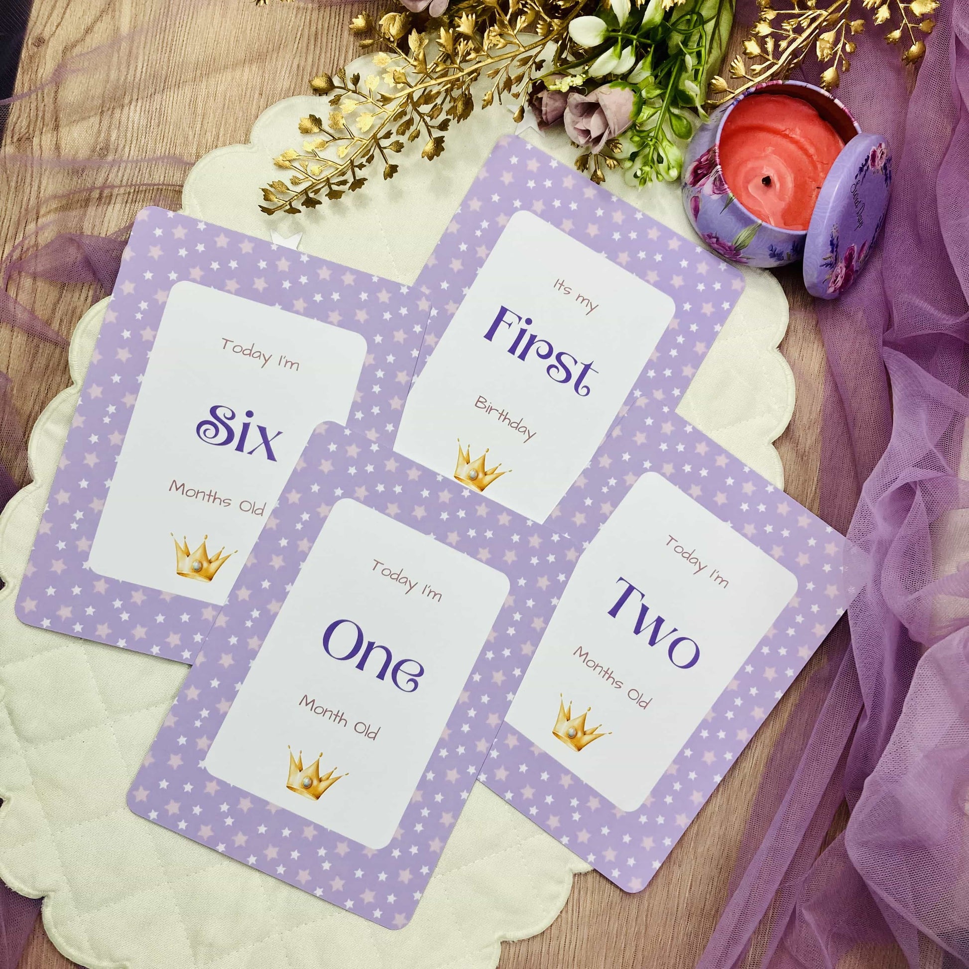 Celebrate your baby girl’s journey like royalty with our enchanting Golden Crown Milestone Cards. Featuring a rich purple background adorned with elegant golden crowns, these cards bring a regal touch to every milestone photo – from her first smile to her very first birthday.